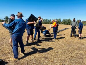 Photo 2: Many hands make light work – everyone lends a hand to measure fertiliser caught in trays laid out across a paddock.
