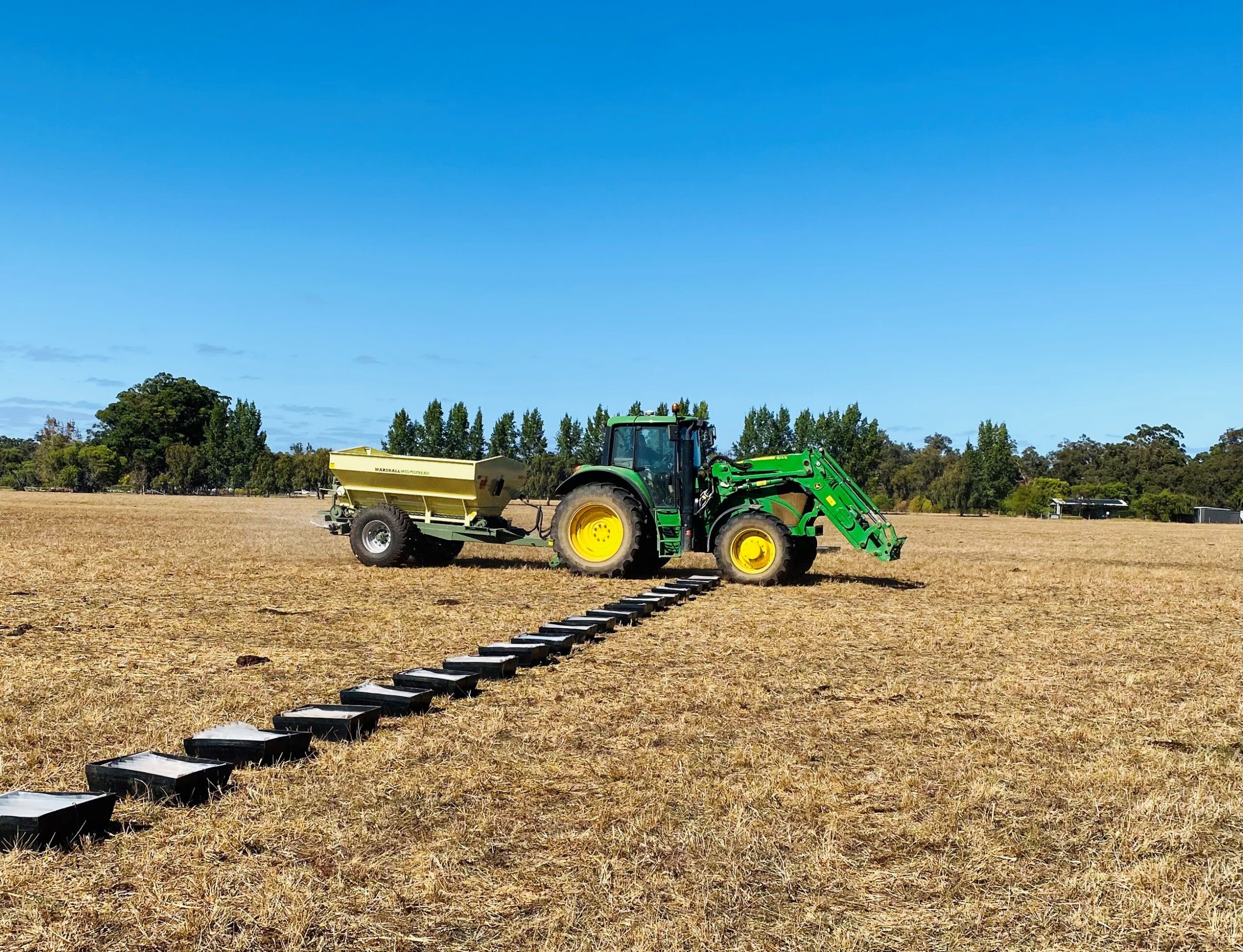 Photo 3: A tractor and fertiliser spreader run through the paddock. Fertiliser is caught in trays laid out and measured to determine the spread pattern.